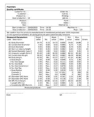 我們的安瓶機(jī)還備有在線攝像的尺寸和外觀檢測系統(tǒng),可同時檢測到安瓶的所有缺陷,對安瓶百分百檢測,通過檢測的安瓶保證百分之百是合格的,該生產(chǎn)線還裝有生產(chǎn)信息的記錄系統(tǒng),自動生成產(chǎn)品的檢驗報告