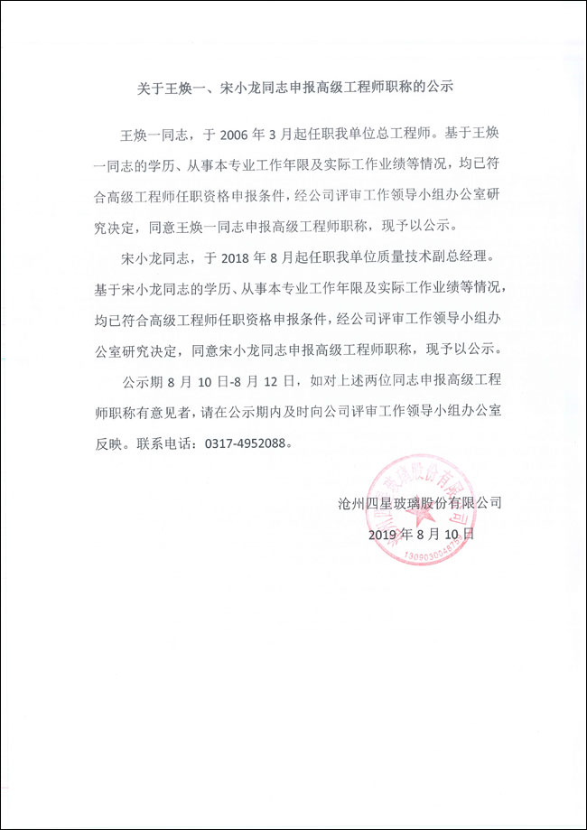 關(guān)于王煥一、宋小龍同志申報高級工程師職稱的公示 |