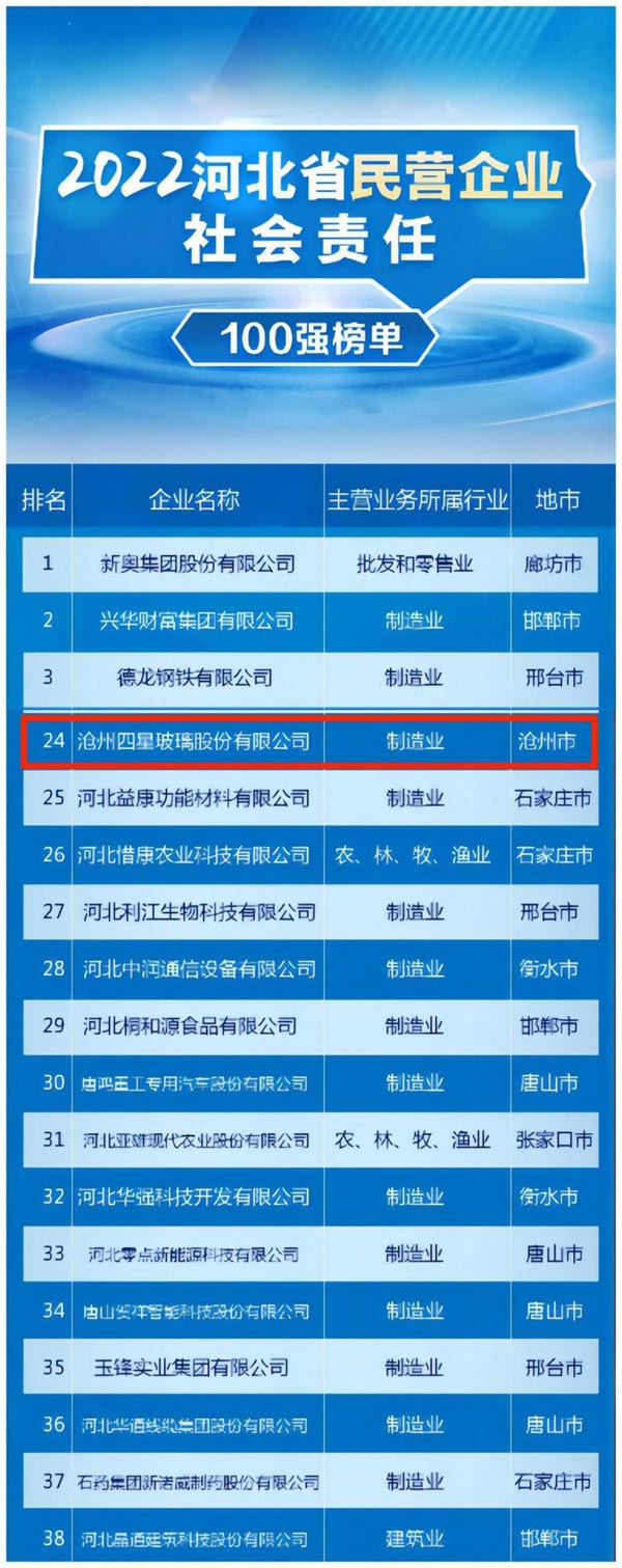 滄州四星玻璃入選2022年“河北省民營企業(yè)社會責(zé)任100強”榜單 |